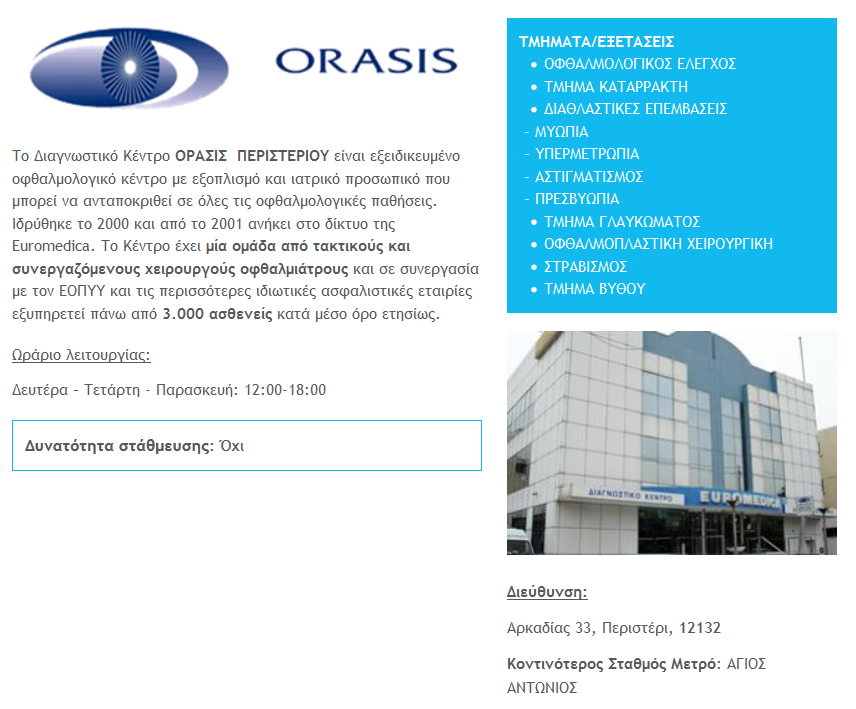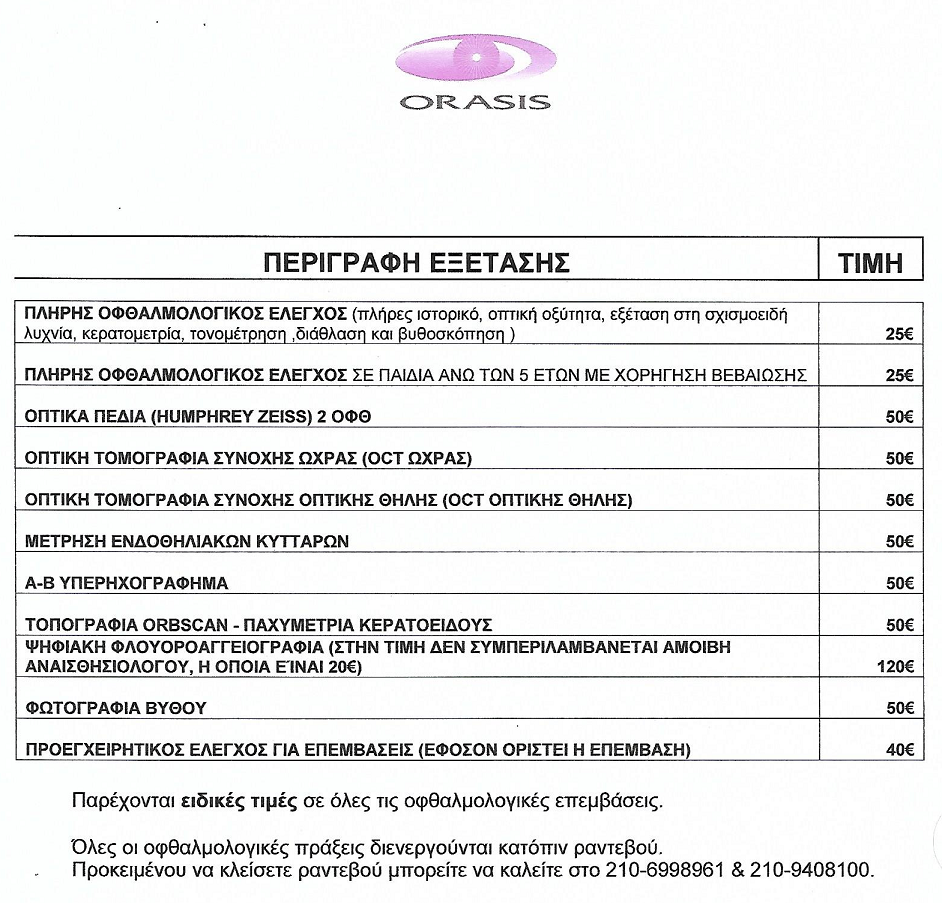 Προσφορά από το διαγνωστικό κέντρο ORASIS A.E με ειδικές τιμές προς τα μέλη του συλλόγου μας. Προσφορά πλήρη οφθαλμολογικό έλεγχο ( πλήρες ιστορικό , οπτική οξύτητα , εξέταση στη σχισμοειδή λυχνία , κερατομετρία, τονομέτρηση , διάθλαση και βυθοσκόπηση ) στην προνομιακή τιμή των 25 ΕΥΡΩ . Επίσεις , για όλες τις ειδικές οφθαλμολογικές εξετάσεις ( π.χ Οπτικά Πεδία , O.C.T κα. ) όλα τα μέλη του συλλόγου , με ενημερωμένη κάρτα μέλους το 2019 , θα τύχουν των κάτωθι προνομιακών τιμών .
