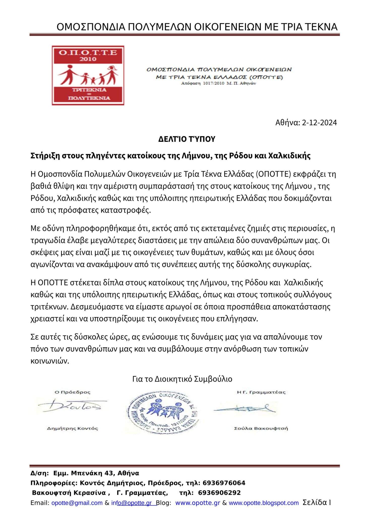 Η Ομοσπονδία Πολυμελών Οικογενειών με Τρία Τέκνα Ελλάδας (ΟΠΟΤΤΕ) εκφράζει τη βαθιά θλίψη και την αμέριστη συμπαράστασή της στους κατοίκους της Λήμνου , της Ρόδου, Χαλκιδικής καθώς και της υπόλοιπης ηπειρωτικής Ελλάδας που δοκιμάζονται από τις πρόσφατες καταστροφές.
