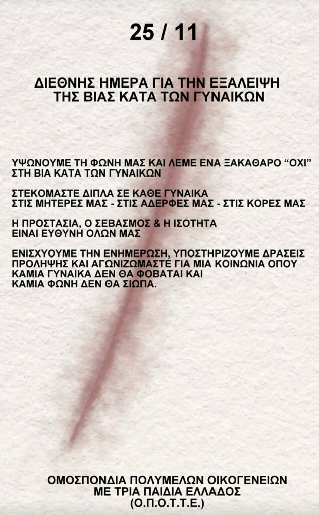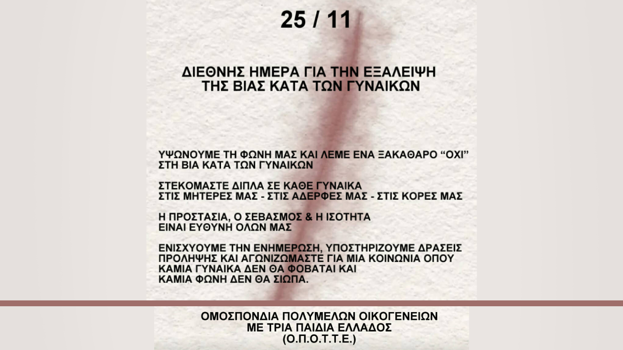 Νέα25 Νοεμβρίου-Διεθνής Ημέρα για την Εξάλειψη της Βίας κατά των Γυναικών 25 Νοεμβρίου, 202525 Νοεμβρίου, 2025 - από τον/την admin - Αφήστε ένα σχόλιο Προώθηση